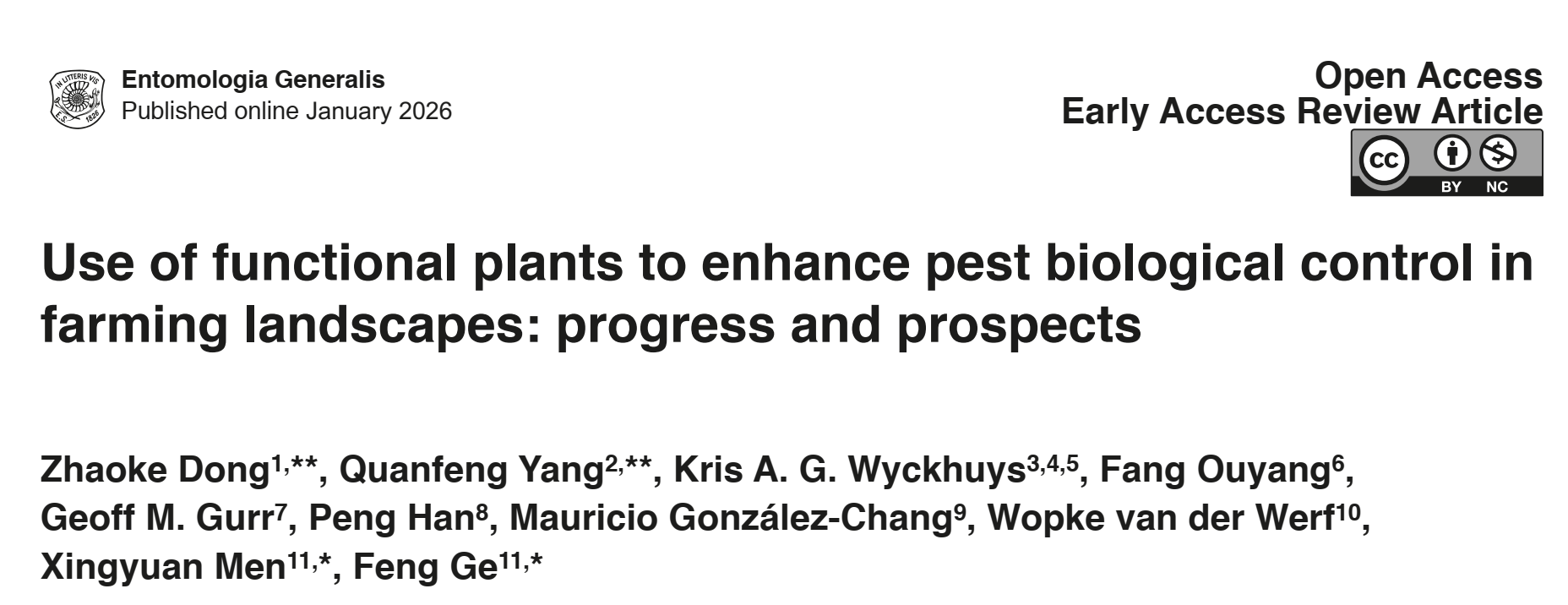 近日,由yl6776永利集团董兆克副教授联合国内外昆虫生态学专家完成的综述论文《Use of functional plants to enhance pest biological control in farming landscapes: progress and prospects》在国际昆虫学期刊 Entomologia Generalis (一区Top期刊,IF=4.6)上发表。该综述提出并系统阐述了功能植物(functional plants)这一概念,聚焦它们如何通过多种生态机制促进害虫生物防治并服务于更广泛的农业生态系统功能。