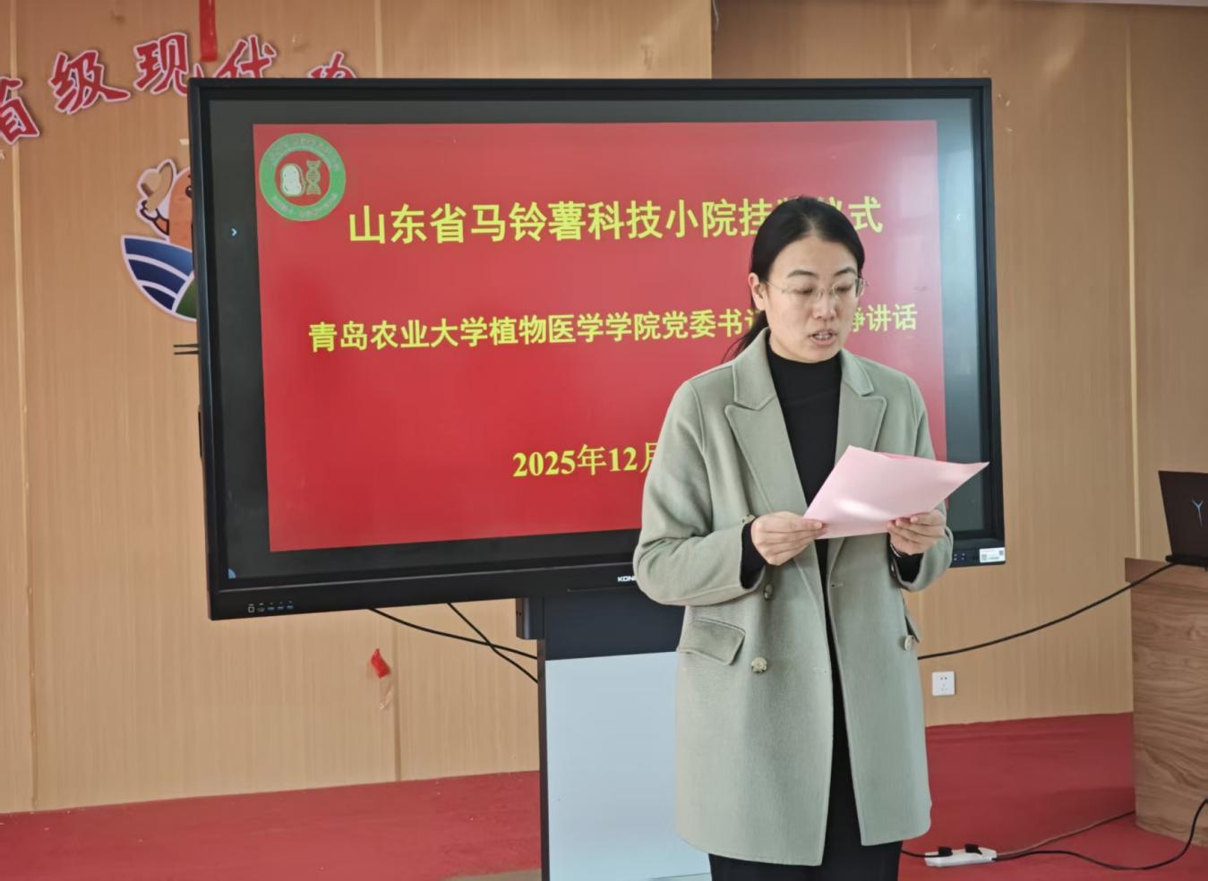 仪式伊始,山东胶州马铃薯科技小院首席专家、yl6776永利集团曹欣然副教授详细汇报了科技小院的筹建背景、核心任务与发展规划,让现场嘉宾全面了解了小院的定位目标与建设蓝图。胶州市科协副主席郭飞在致辞中表示,胶州市科协始终致力于搭建校地合作桥梁,科技小院的成立为胶州农业科技创新注入了新活力,未来将持续为小院发展提供坚实保障,推动科技成果落地生根。