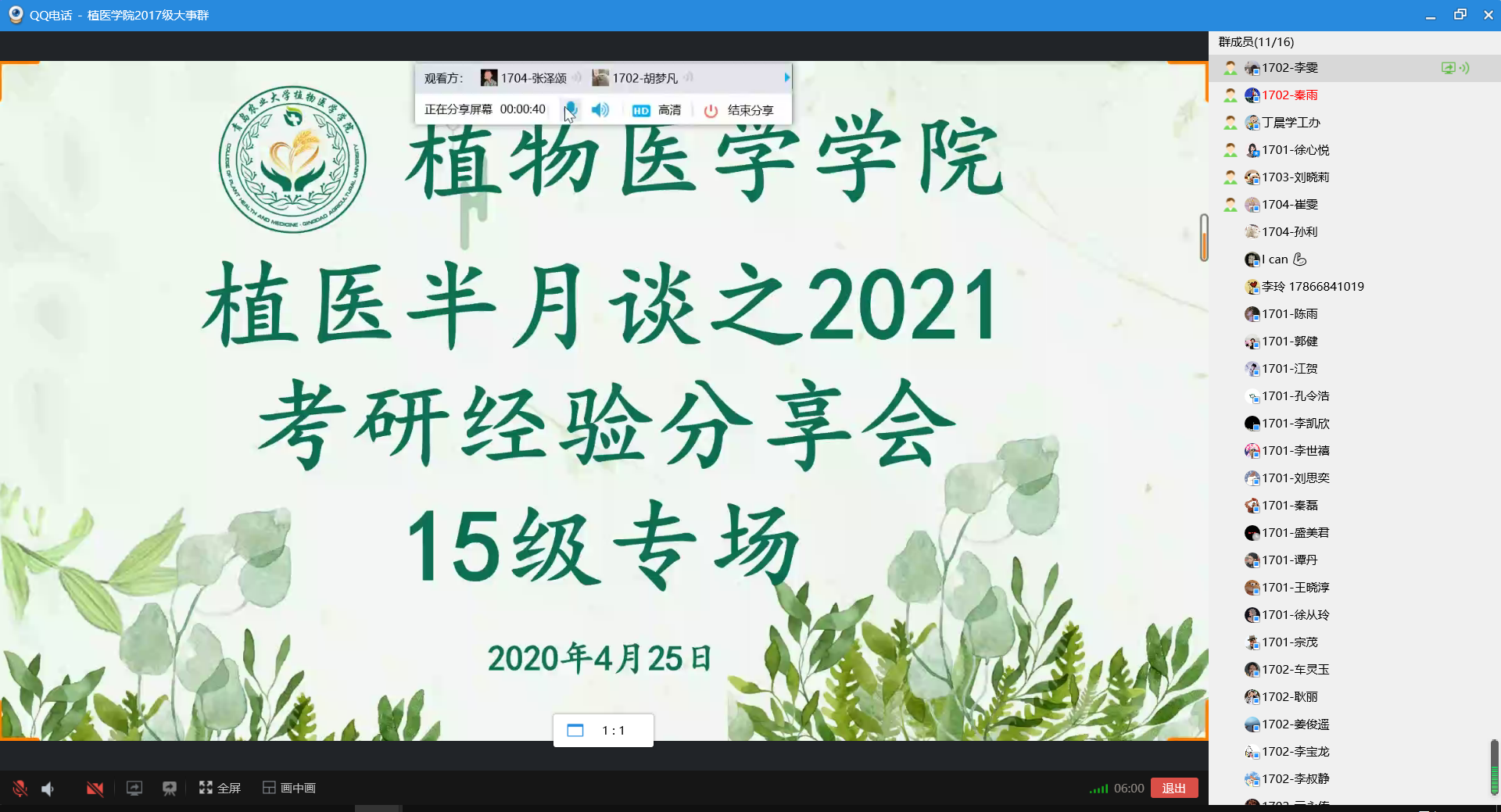 本次考研经验分享会,通过四位学长学姐的考研经验分享,使同学们对考研过程有了一个更系统、更清晰的认识,为同学们提供了明确的复习方向,对2017级考研同学具有指导意义,使同学们进一步认清当前形势,坚定考研奋斗目标,增强考试信心。本次植医半月谈之考研经验分享会为考研专场第三场,后期学院还会邀请多位优秀毕业生及导师进行经验分享,全面做好学生的考研指导工作。